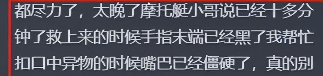 当他的妻子听到医生说救不回来的时候,他的妻子在一旁崩溃大哭。更让人心痛的是,整个过程,他们的女儿都看在了眼里。原本一家人开开心心地出来游玩,现在家里的顶梁柱就这样没了,这样的打击谁能受得了呢。他的妻子非常后悔,要是当时拉住他不给他下水,他就不会死了。